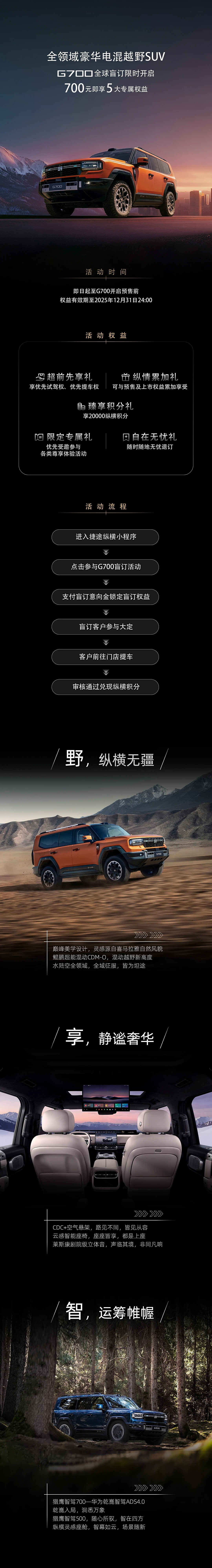 IT之家 8 月 29 日音讯,在今天开幕的 2025 成齐车展时候,奇瑞汽车秘书,“全规模豪华电混越野 SUV”捷途纵横 G700 崇拜开启盲订,700 元可享优先试驾 / 提车、20000 纵横积分等权力。