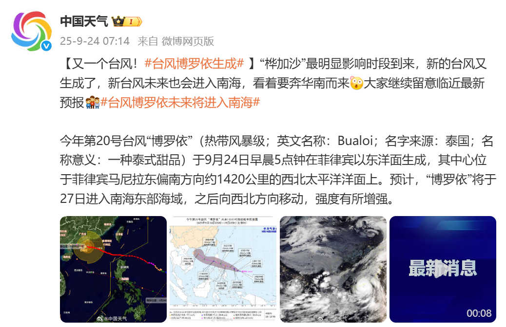 24日5时,本年第20号台风“博罗依”在菲律宾以东瀛面生成。24日17时,“博罗依”中心位于距离菲律宾马尼拉东偏南边向约1270公里的洋面上,中心隔邻最大风力为8级(20米/秒)。瞻望其将向西朔地方移动,9月26日前后穿过菲律宾吕宋岛干涉南海东部海面,强度逐步加强到台风级,9月28日—29日趋向海南岛东部海面。