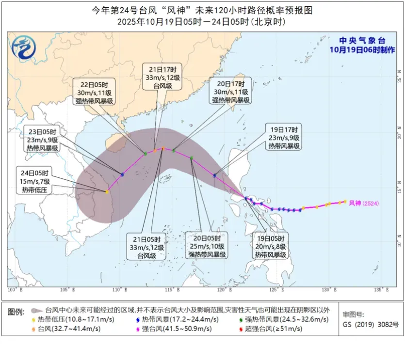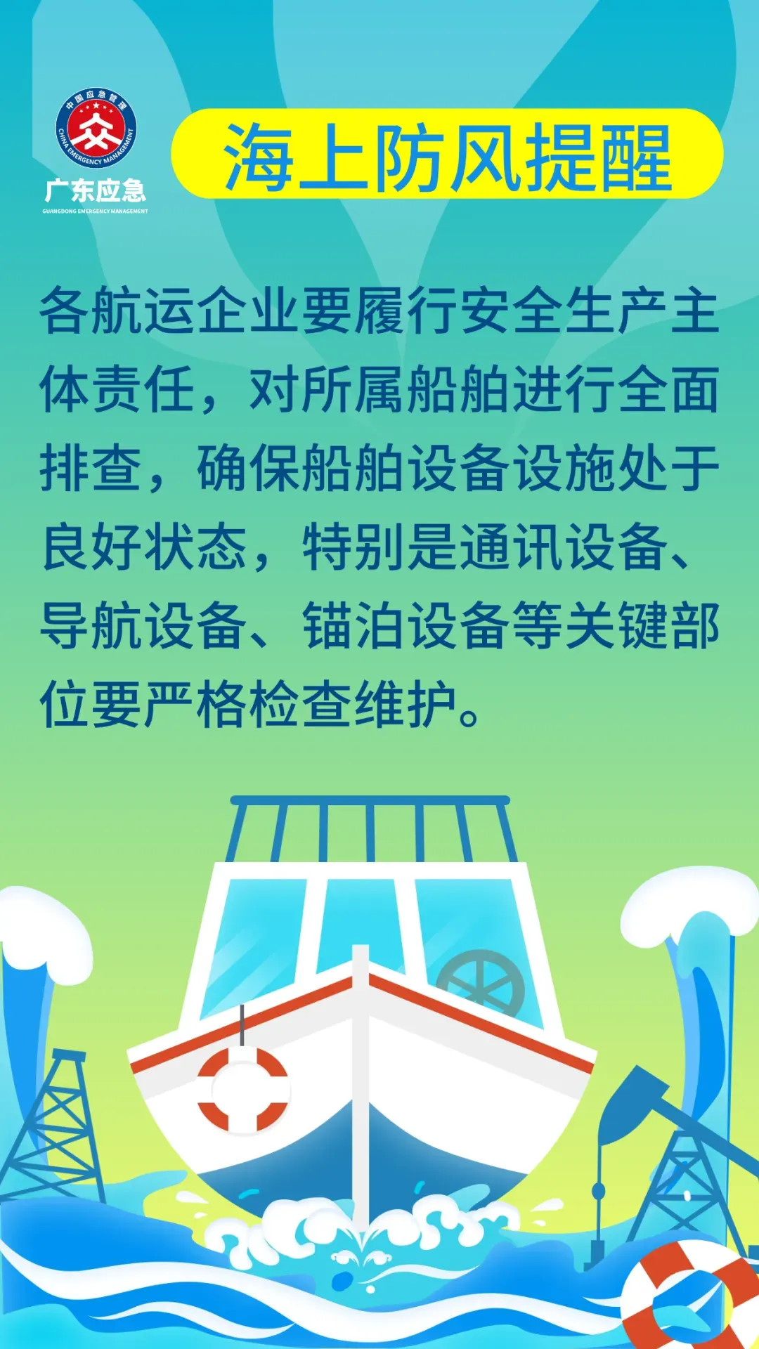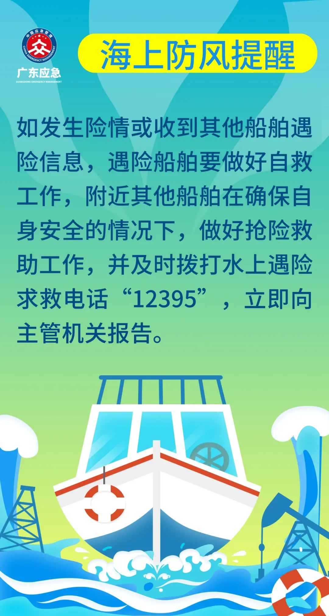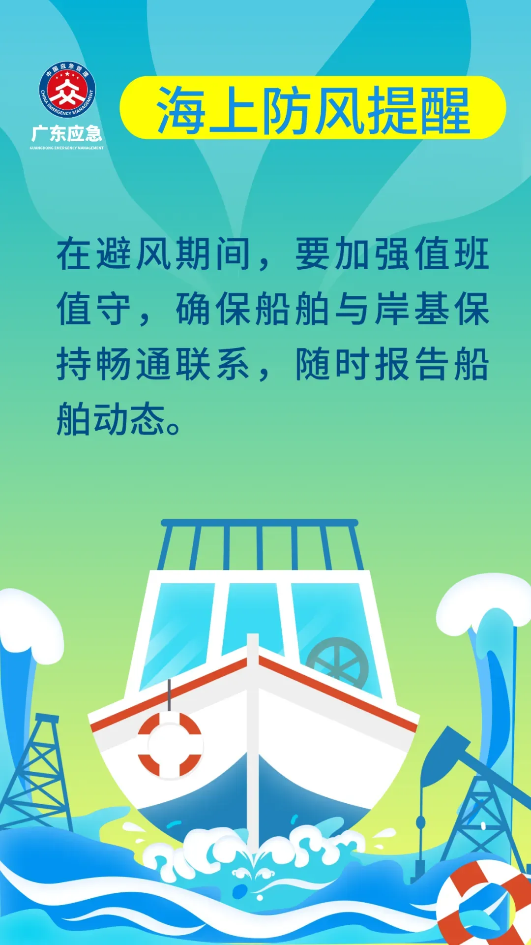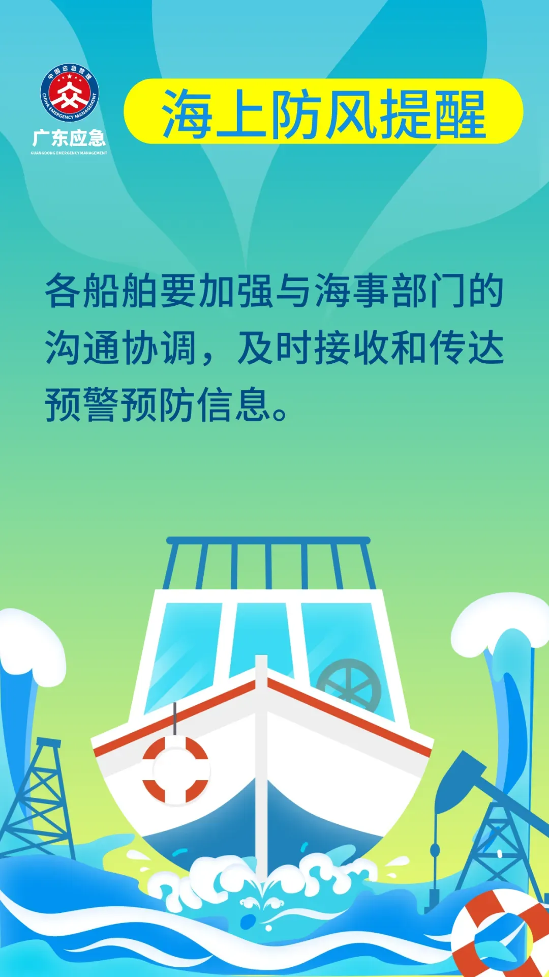 10月18日,广东省防汛防旱防风总开荒部办公室印发关键告知,条款珠江口以东海域(含深圳)和珠江口以西海域离别于10月19日12时、19日20时前落实“六个百分百”款式:统共在广东省海域功课的渔船一齐就近回港避风;渔排滋生东谈主员、海洋牧场东谈主员一齐上岸避险;海优势电施工平台东谈主员一齐安全裁撤;州里船舶、海钓船、游艇等讳饰出海;跨海航路、滨海旅游景区应时关停。广东省在南沙海域功课渔船无邪避风,在福建、海南海域功课渔船按照当地防风提醒落实防风款式。